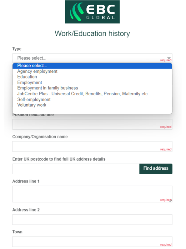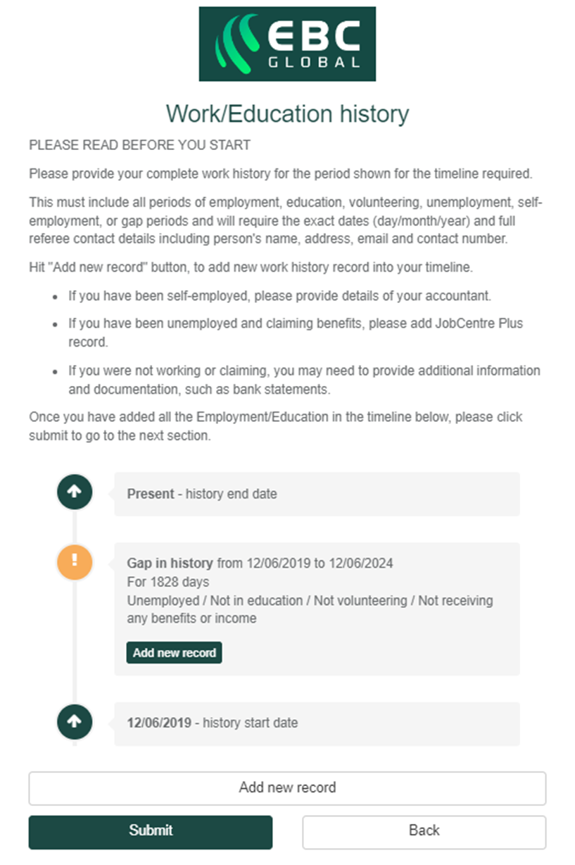 Employment or education history is added until timeline required is complete. This includes covering gaps over a designated period if required.