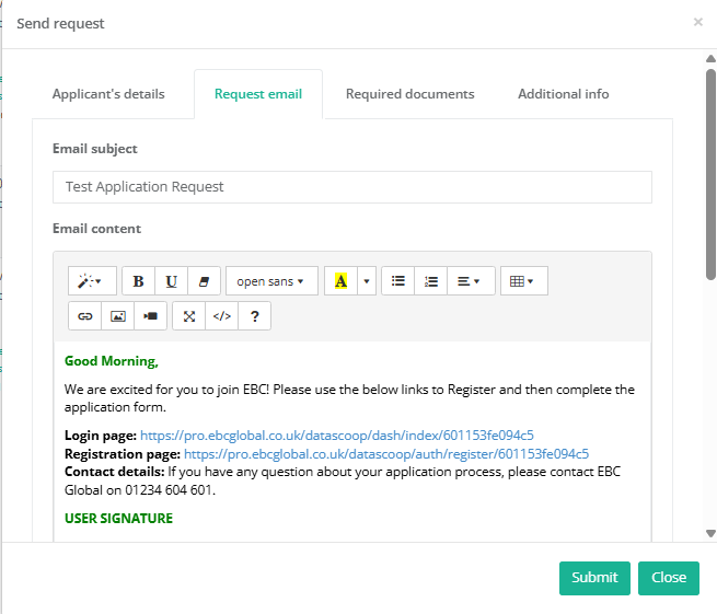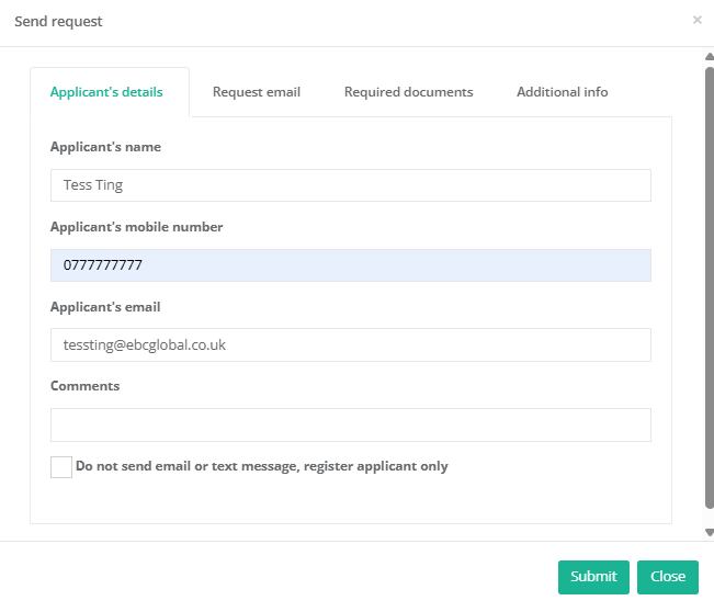 Once you are happy with all of the details, press the Submit button and the application request will be emailed to the candidate. They will also receive a text message asking them to check their emails and complete their registration.