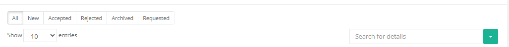 You can use the buttons along the top of the application to filter by NEW, Accepted, Rejected or Requested applications (or All to see everything!). You can use the Search for Details box to filter by candidate name or email address: